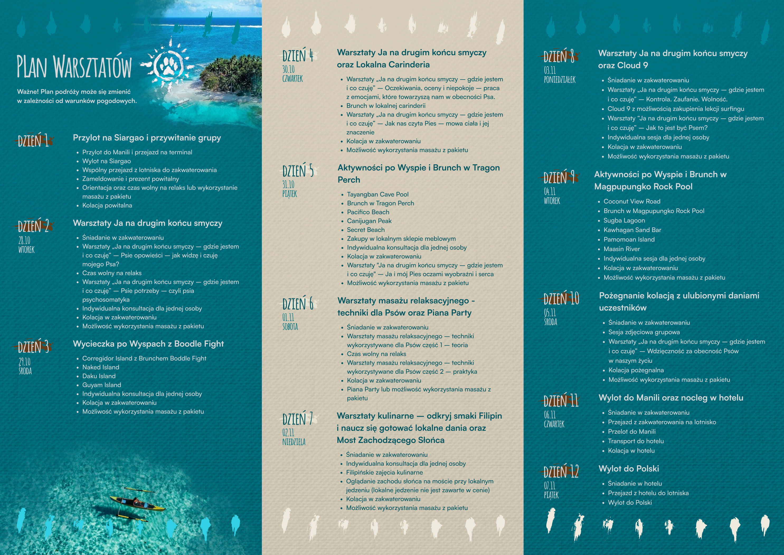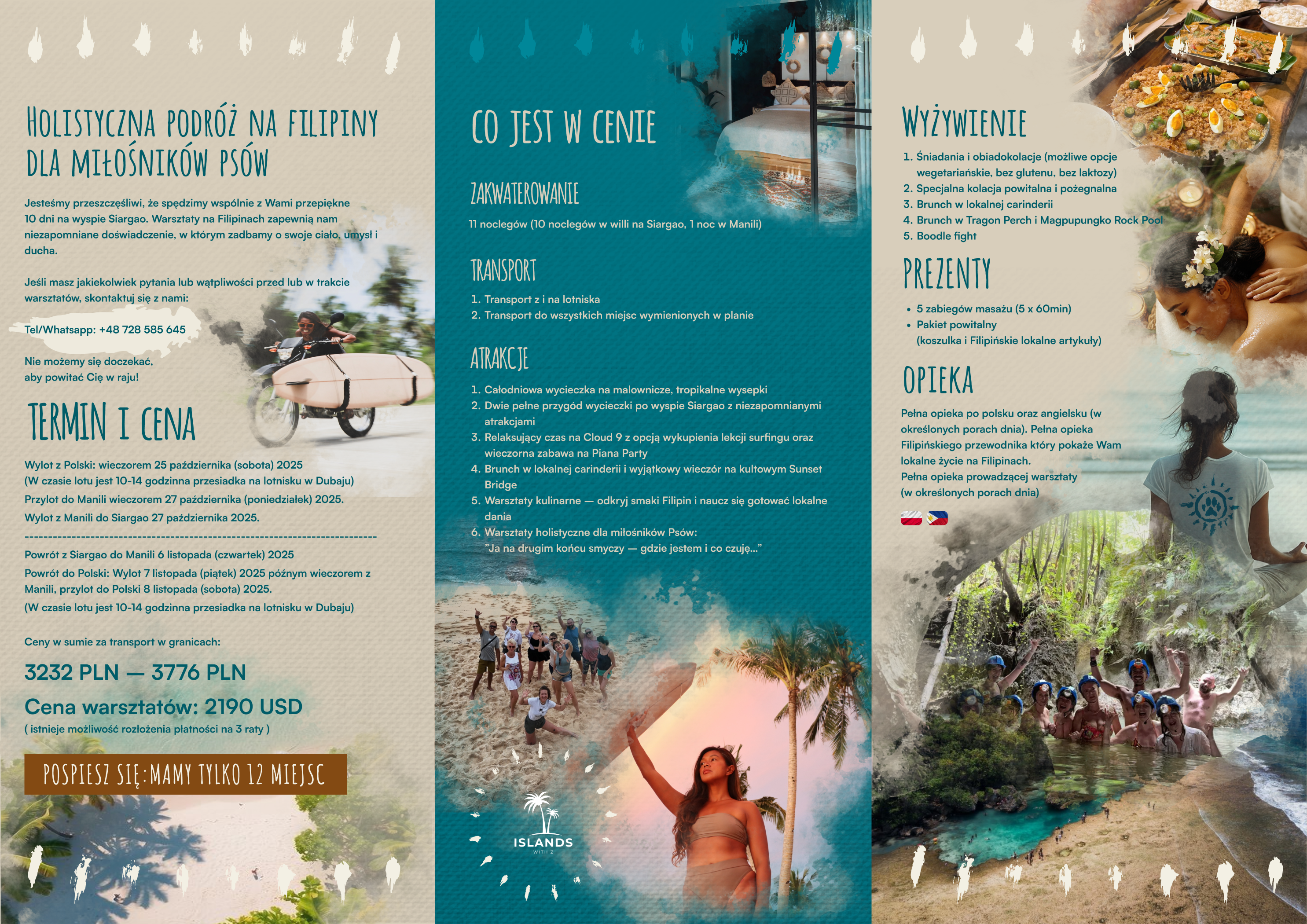 Oprócz pracy nad sobą, będzie też część teoretyczna o Psach – ich potrzebach, wyzwaniach, predyspozycjach i funkcjonowaniu w ludzkim świecie. Czekają Cię wykłady, ćwiczenia w grupie oraz indywidualne sesje z doświadczoną behawiorystką. Przyjrzymy się Waszej relacji i poszukamy realnych dróg do jej poprawy – z szacunkiem dla granic i możliwości każdej ze stron. Nie ma złych Psów – czasem to opiekunowie są zagubieni. Jedziemy na Filipiny, by przy wsparciu Natury odnaleźć siebie – i po powrocie dzielić się tym, co prawdziwe.